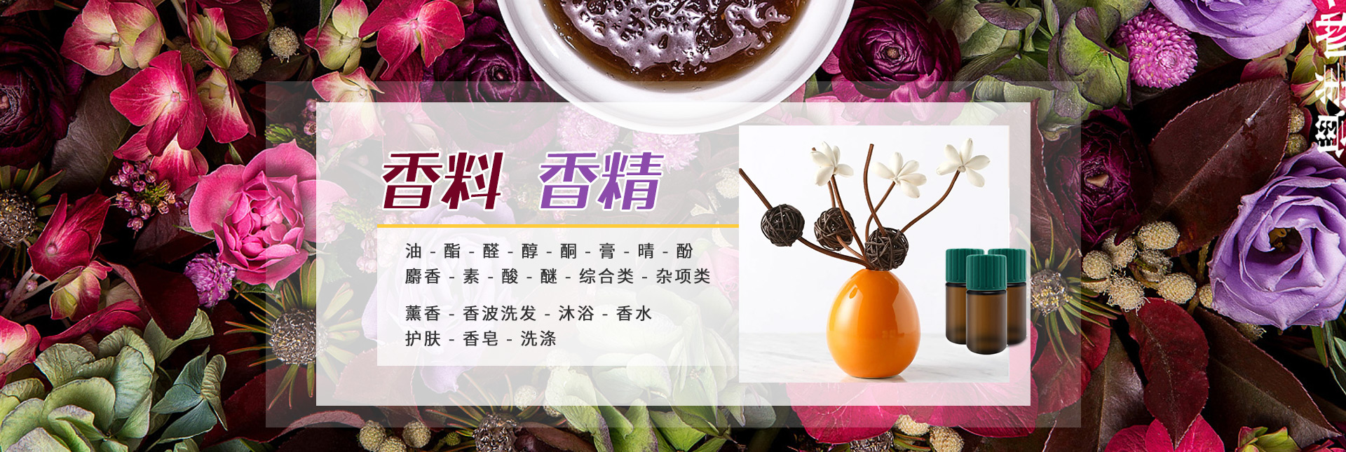 目前主要香料产品有油、酯、醛、醇、酮、膏、晴、酚、麝香、素、酸、醚、综合类、杂环类等14大类,产品品种已达1000余种。公司拥有先进的技术设备及调香师,技术力量雄厚,能为您提供所需的所有日用香料。以好的品质满足客户需求,并远销海内外。现公司进出口业务稳步发展,形成了广泛的营销网络和 经营优势,以丰富的国际贸易经验、良好的信誉和服务赢得了客户的信赖,销量逐年递增。是国内较有影响力的香料分销商。